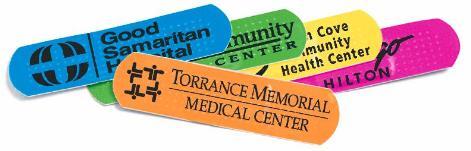 All of our custom printed bandages are manufactured and printed in a sterile FDA approved facility. Don't accept any substitutes. Printed Bandages are available with custom printed wrappers, and a variety of packaging options. We also offer custom printed bandage dispensors and first-aid kits. Genuine Band-Aid brand bandages are also available in our dispensers. Full color printing is available. Printing area on standard bandages is 2-11/16" x 1/2". The logo can be printed with a step and repeat pattern, or can be centered. These Printed Bandages are available for promotional, resale, and retail use. Contact us today for current pricing information on custom printed bandages. Custom printed Bandages are now available in custom shapes and colors. Custom bandages are available in any custom packaging option.