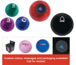 We can print your company logo on top of our stock Fortune Balls or Mini Fortune Balls and keychains. We also have a 2.75" size as an alternative to the 4" balls or the mini keychain size. Our minimum order is 50 pieces. The outer shell is also customizeable in several colors, now including glow-in-the-dark and translucents! For orders of 250 pieces or more we can also customize the 20 answers inside to create a truly unique promotional item for your organization. This unique specialty promotional item can be used for any creative advertising or marketing project. Contact us today!