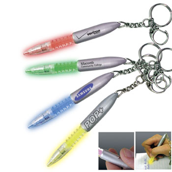 Custom imprinting is available. The push button activates the mini flashlight. Colors available include silver, black, blue, chrome, gold, green, pearl, red, an American Flag design, and more! The newest additions to our light pen line are outlined below. The '7 color light pen' continuiously changes colors, the '3 LED light pen' has multi colored lights, the 'UV Light Pen' has yellow ultra-violet light, and the 'Key Chain Light Pens' are a smaller alternative to the original: