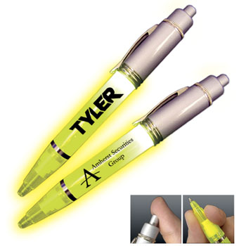 We can print any color text or graphic artwork on Pen Lights. Our lighted pens are available in a variety of styles and colors. There is a 50 piece minimum. Our custom printed Pen Lights are also customizeable with the color of the pen and the light. These are super bright LED pens! They write like regular pens, but can be used in low light or dark areas. These star light pens, black light pens, executive gifts, and promotional items are available with many printing options, your company logo can be added to the upper and/or lower barrel. Push the button on top to turn on the glowing light, and twist the barrel to use the ball point pen. You can also twist off the cap and use it as a flashlight! Batteries are included. Submit a Quote Request now!