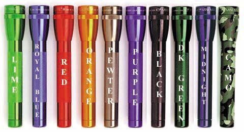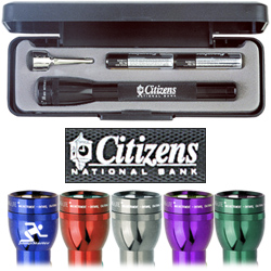 We have a large selection of mag-lite flashlights available with custom engraving or printing on any location on the flashlight. Full Size, Pocket Size, and Key Chain size Mag-Lites make great promotional items for your business. The picture above illustrates a white custom logo engraved on a black Mag-Lite. Colors available include Royal Blue, Red, Pewter, Purple, Dark Green, or Black. Any color imprint or engraving can be applied. Custom gift packaging is also available. All Mag-Lites come with a gift box, alkaline batteries, and a spare bulb. For ordering or pricing terms on custom Mag-Lites, please submit an online quote request. Minimum order is 24 pieces. Please call or write for a full catalog of our Mag-Lites. Non Mag-Lite brand flashlights are also available as an inexpensive alternative. Related Products: We also have several other executive gift items available. Please click here for an online catalog. You can search a database of over 500,000 promotional products at FindPromos.com