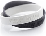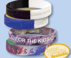 Imprinted Rubber Wristbands are a great low cost alternative to this item. Differences: The Silicone wristband is a silicone composite and molded with the copy embossed (as pictured above in yellow), our Rubber bands bracelets are made from elastic latex free rubber and we imprint the copy permanently on the bracelet. Minimum order for rubber wristbands is only 500 pieces, 1000 for Silicone.