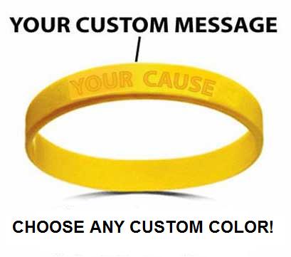 "The LIVESTRONG bands were just the beginning" according to the Boston Herald. Our silicone wristbands are now used to promote a "rainbow of causes". Great for fundraisers, special events, or retail, we manufacture Silicone Wrist Bands custom molded with your own logo or message. We manufacture them exactly like the popular yellow bands but with your own color and message for your cause and awareness needs. These bracelets are debossed with your message, don't accept cheap imitations with screen printed messages, our wristbands are actually molded and debossed! Our bands are made with seamless construction, unlike poor quality imitations, our custom bands will not have seams. All wristbands are shipped individually polybagged. Standard size measures 4"L x 1/2"W x .08"T. Please note that the minimum order quantity is 250 pieces. Submit a Quote Request now for more information. You can choose any color for your bands. There is no extra charge for marble, camoflauge, or multi-color bands. Or provide your own material to be embedded within our clear bands. Youth Size is also available. Standard delivery is 3 weeks, however we now offer RUSH production to meet your needs. As an even faster option, we also offer USA Bands, silicone wristbands custom made in the USA for super fast production time. As an alternative to molded and debossed bands, you can now order screen printed silicone wristbands